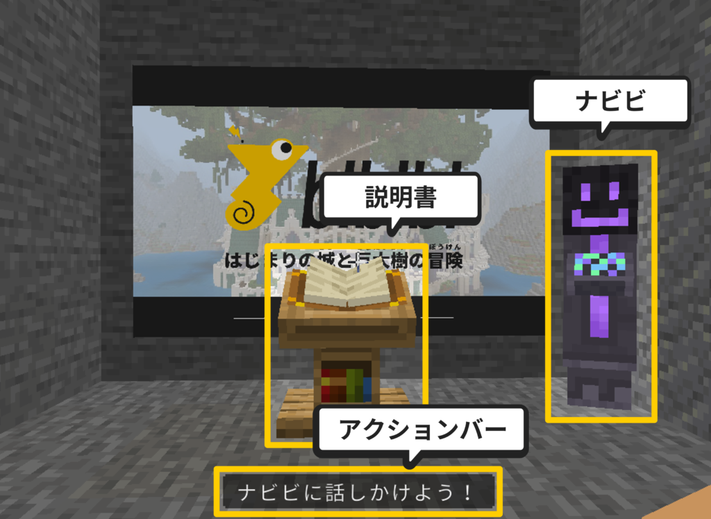 ワールドに入ったらアクションバーやナビビの説明を読んで進めていきましょう。