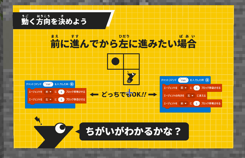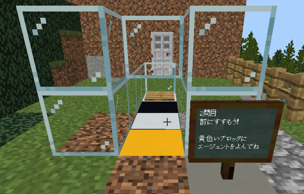 問題は基本的に黄色のブロックにエージェントを呼んで、感圧板(木の板)まで1度の実行でたどり着くようにプログラムを組んでいきます。