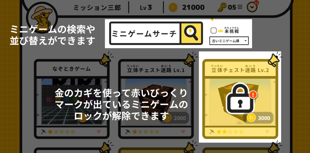 赤いびっくりマークがついているミニゲームのロックを「金のカギ」を使って解除しましょう!