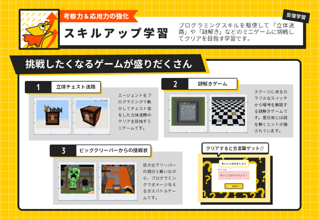 コース学習で身につけたプログラミングスキルを活用してプログラミングでクリアを目指すミニゲームに挑戦する学習スタイルです。「アスレチック」や「謎解き」などマイクラでおなじみのミニゲームとプログラミングが合体したワールドで楽しみながらプログラミングスキルを反復・応用学習していきましょう。
