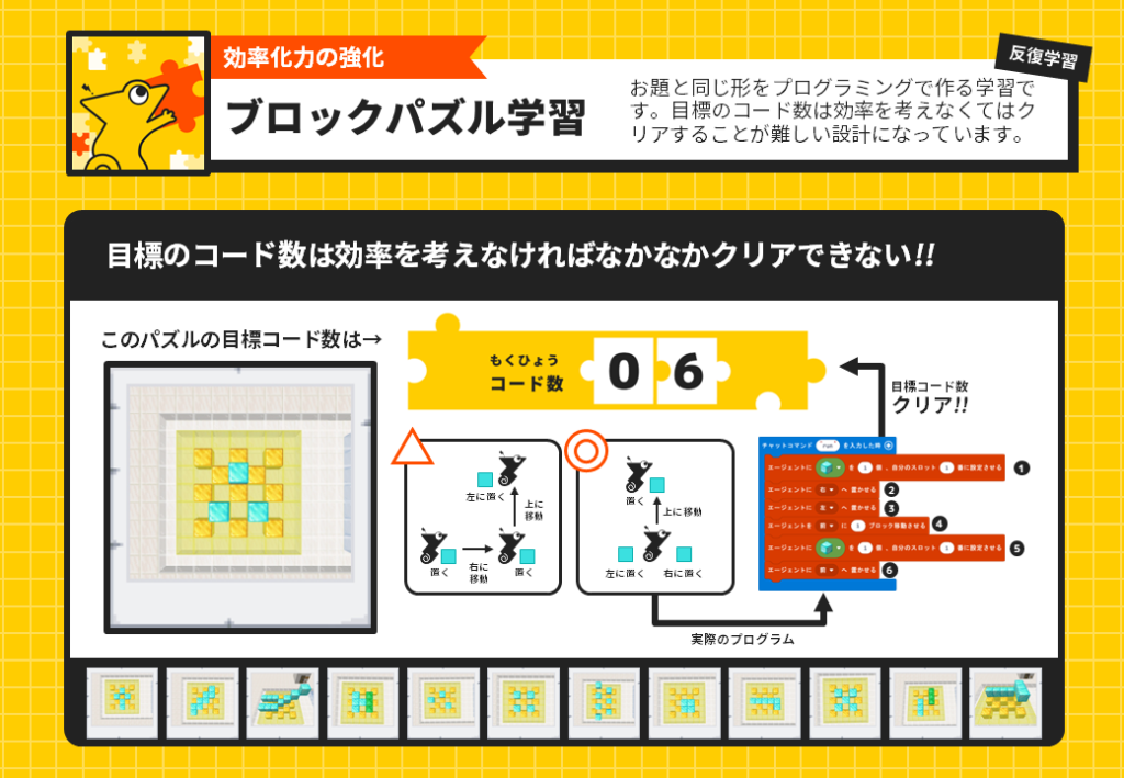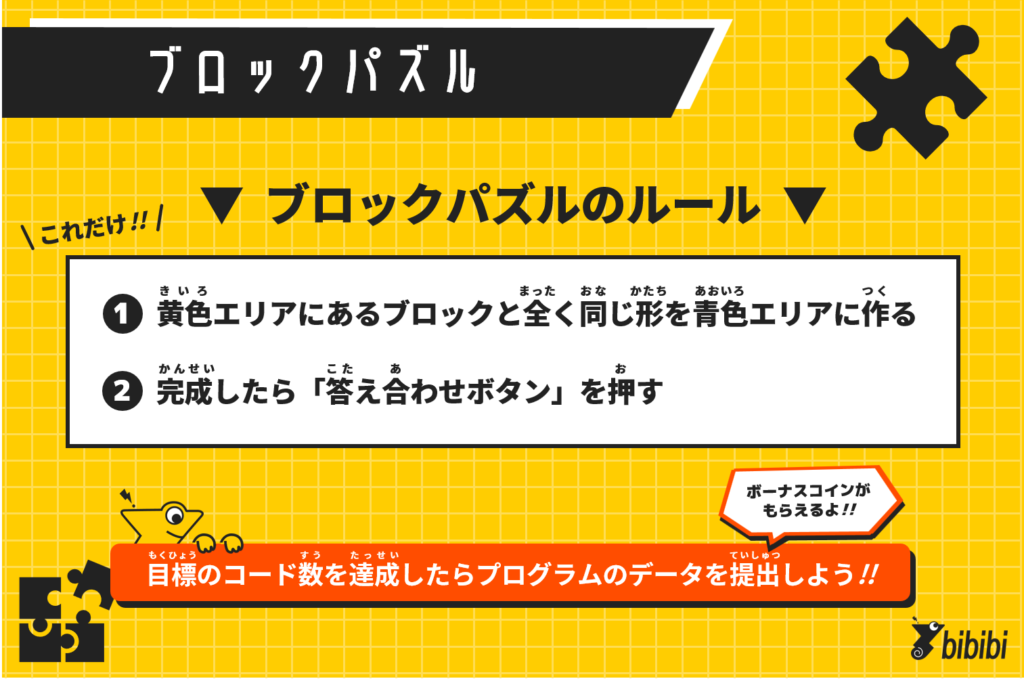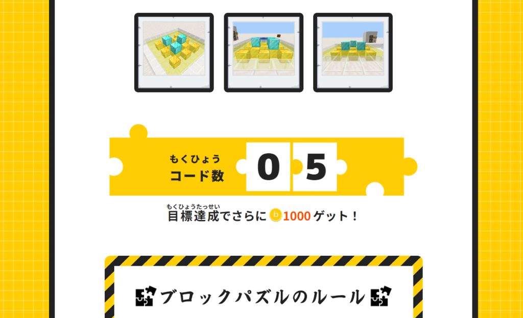 目標コード数の下にはブロックパズルのルールについて記載しているのでよく確認してから学習に取りかかってください。