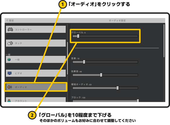 マイクラの音量を調節します。メインを下げておかないとマイクラの音が大きすぎて他の人の声が聞こえにくいです。