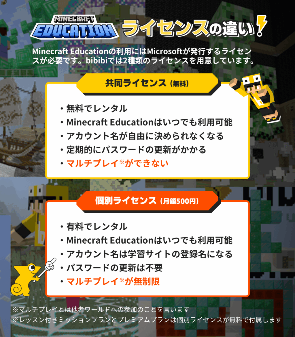 bibibiでは【共同ライセンス】と【個別ライセンス】の2種類のMinecraft Educationライセンスを用意しています。